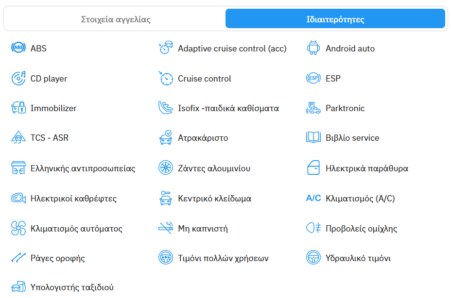 Διαθέτει πολλές ιδιαιτερότητες, όπως υπολογιστή ταξιδιού, isofix για παιδικά καθίσματα, είναι ελληνικής αντιπροσωπείας, μη καπνιστή, ηλεκτρικά παράθυρα, ζάντες αλουμινίου, τιμόνι πολλών χρήσεων, υδραυλικό τιμόνι, κλιματισμό (A/C), cruise control, immobilizer, ράγες οροφής, TCS – ASR, Android auto, προβολείς ομίχλης, adaptive cruise control (acc), ESP, ABS, ηλεκτρικοί καθρέφτες, ράδιοκασετ/νο, parktronic, κεντρικό κλείδωμα και αυτόματο κλιματισμό.